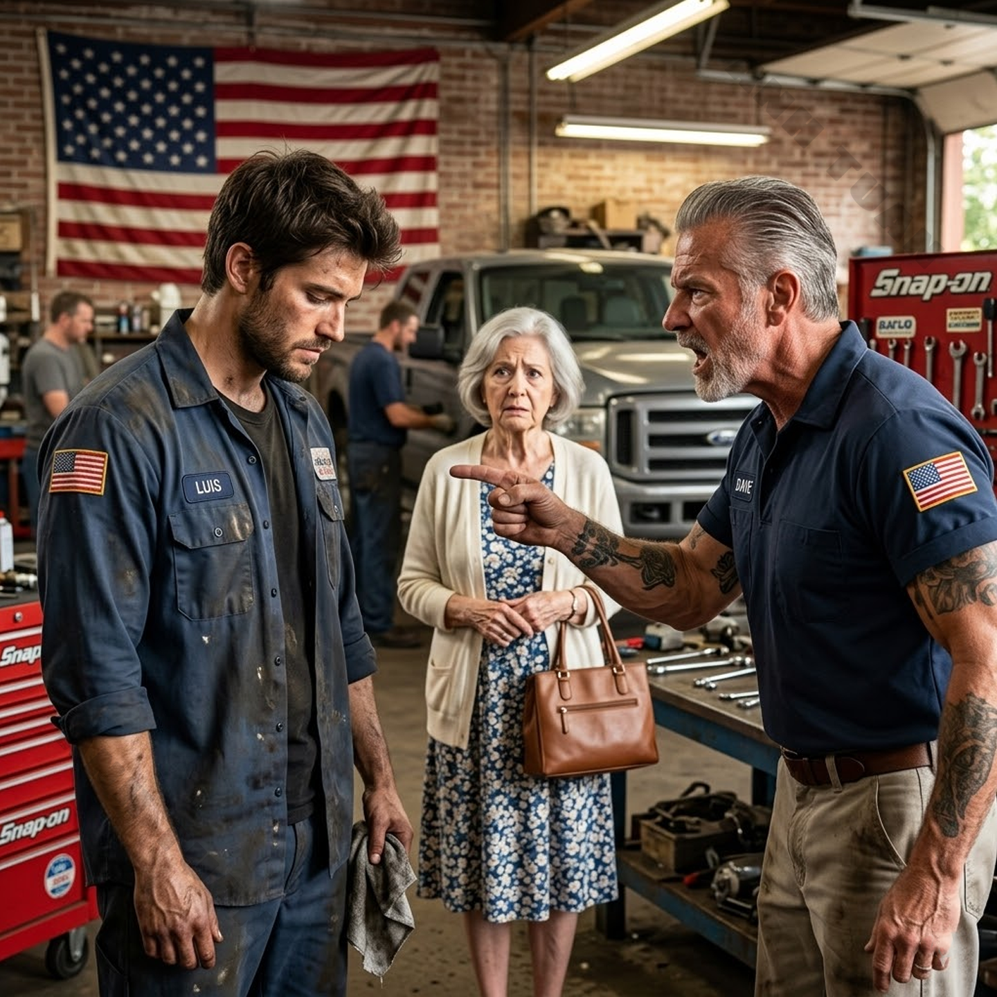 Inside Bay Three, Luis Anco leaned over the open hood of a Ford F-150 and reached down with a socket wrench into a space too tight for comfort. His knuckles were nicked. A streak of black grease ran from the heel of his hand almost to his elbow. Sweat darkened the collar of his work shirt, and the patch sewn over his chest that said LUIS had been washed so many times the red thread around the letters had gone pale. He was twenty-seven, though the set of his shoulders and the tiredness around his eyes often made him seem older. He had the kind of hands that told the truth before a man ever opened his mouth. Rough palms. Cuticles split from solvent and cold mornings. Old burns. Fresh scrapes. Hands that fixed things for people who barely looked at the face attached to them.