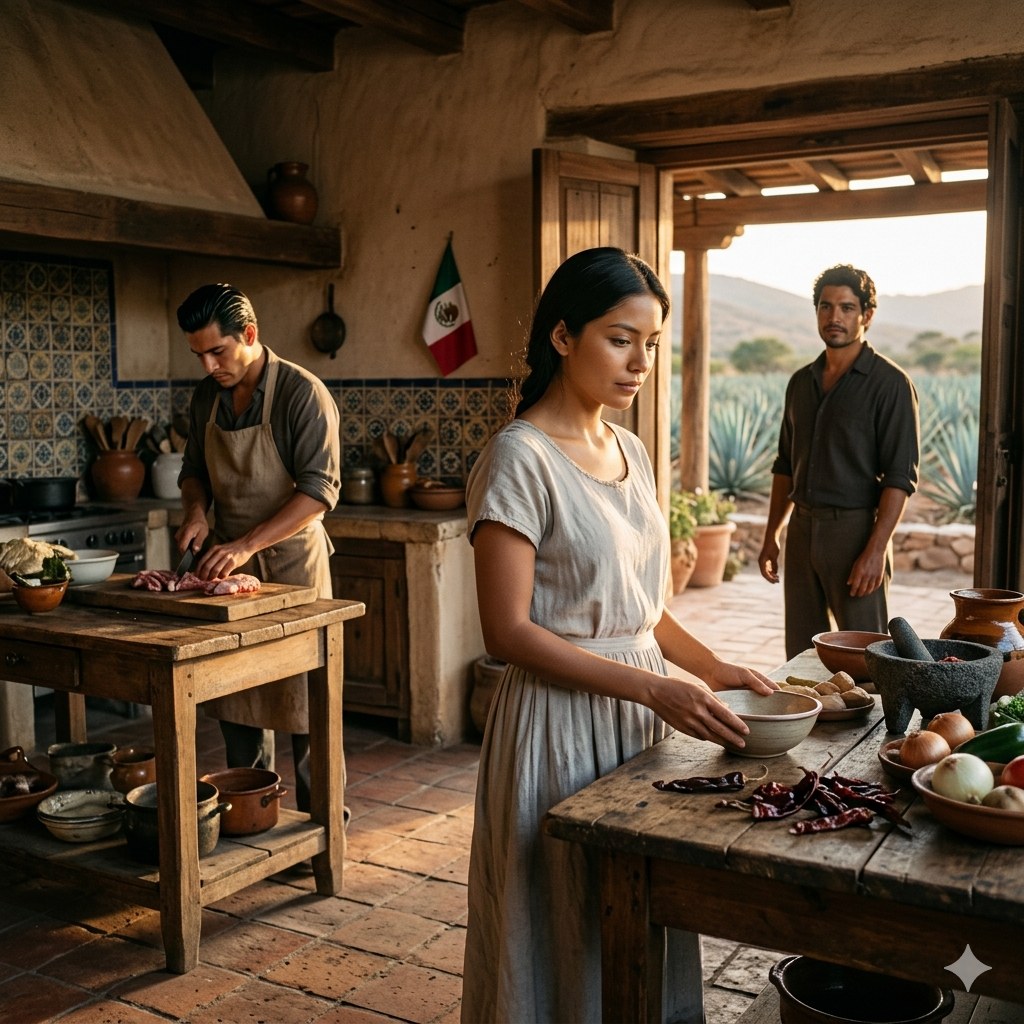 Muros blancos, arcos amplios, un patio central rodeado de columnas gruesas y un aire que mezclaba tierra húmeda, leña encendida y hojas frescas de agave recién cortadas. Había vida ahí. Movimiento. Trabajo constante. Hombres entrando y saliendo, cargando herramientas, hablando en voz baja, respetando una jerarquía invisible que se sentía en cada rincón.